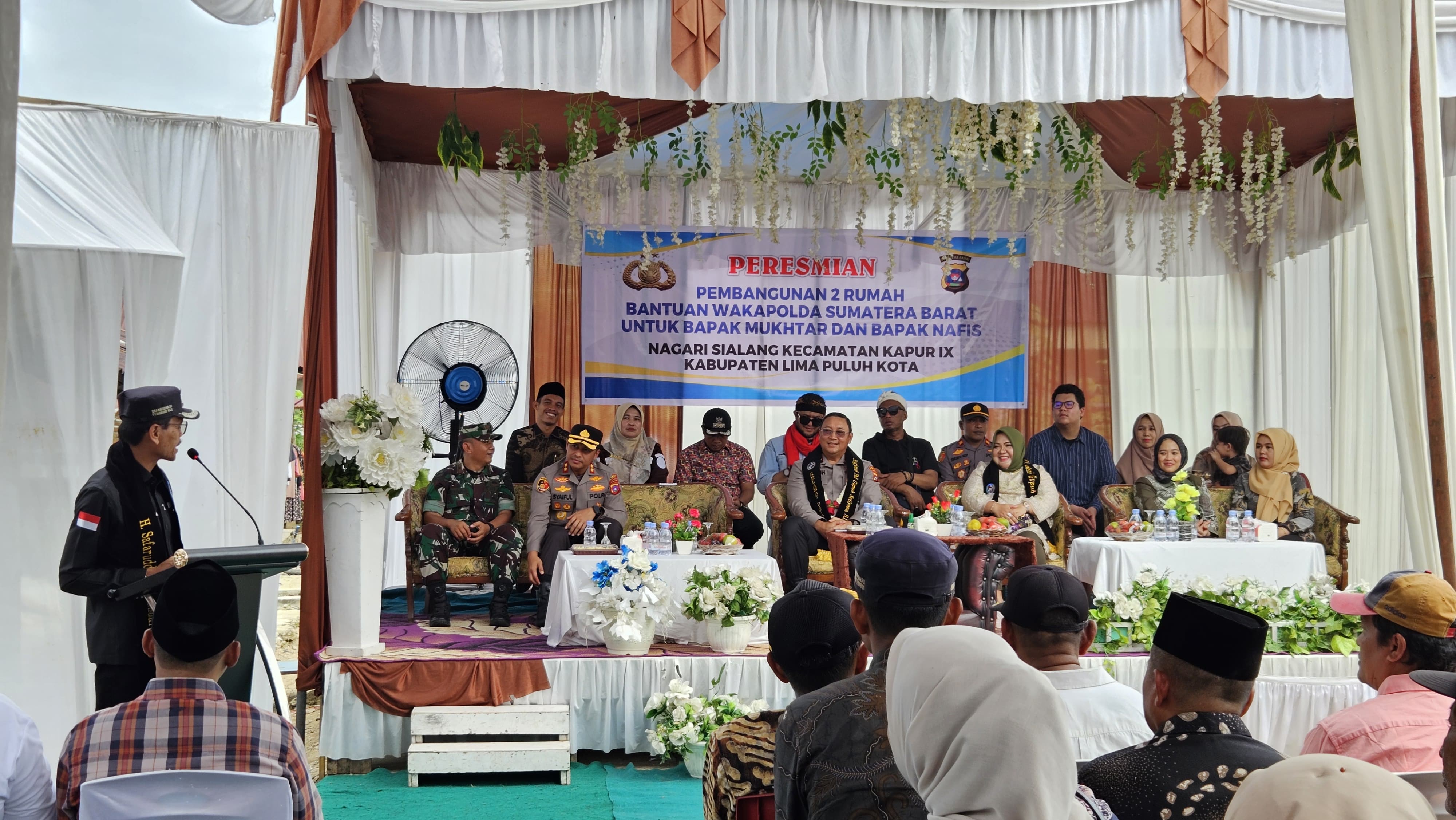 LIMA PULUH KOTA, CARAPANDANG - Bupati Lima Puluh Kota Safaruddin Dt. Bandaro Rajo menyampaikan ucapan terima kasih atas bantuan Dua unit rumah layak huni dari Wakapolda Sumbar untuk dua warga Nagari Sialang.