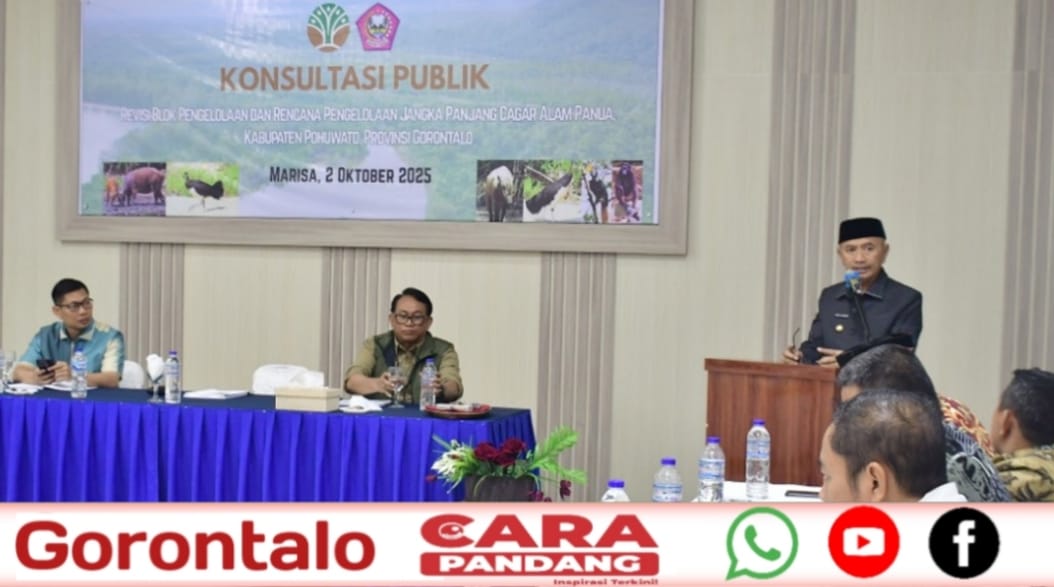 POHUWATO, CARAPANDANG - Balai Konservasi Sumber Daya Alam (BKSDA) Sulawesi Utara menggelar Konsultasi Publik terkait revisi blok pengelolaan dan rencana pengelolaan jangka panjang kawasan konservasi Cagar Alam Panua. Kegiatan ini dibuka secara resmi oleh Bupati Pohuwato, Saipul A. Mbuinga, di Aula Marina Beach Resort (MBR), Marisa, Kamis (02/10/2025).