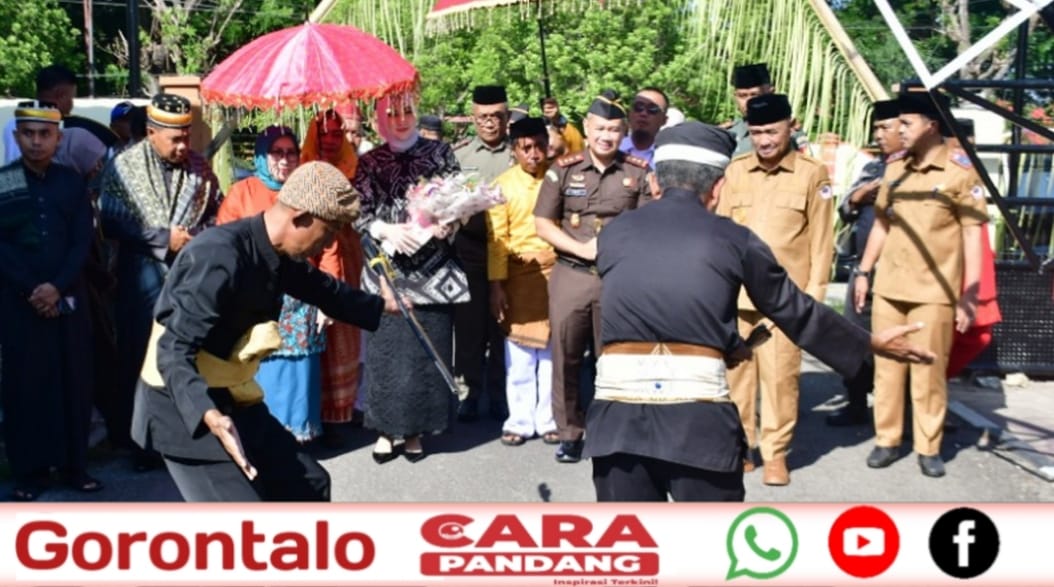 Upacara adat Mopotilolo, yang merupakan tradisi penyambutan tamu kehormatan di Gorontalo, berlangsung penuh makna sejak Kajari bersama istri turun dari kendaraan di pintu masuk Kejari Pohuwato.