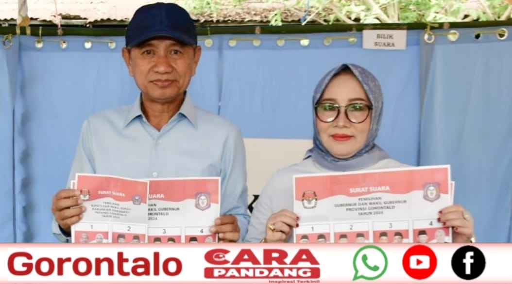 POHUWATO, CARAPANDANG - Bupati Pohuwato, Saipul A. Mbuinga, bersama sang istri, Selvi Mbuinga Monoarfa, melakukan pencoblosan pada Pemilihan Kepala Daerah (Pilkada) serentak 2024 di TPS 002 Desa Sipatana, Kecamatan Buntulia, Rabu, (27/11/2024).