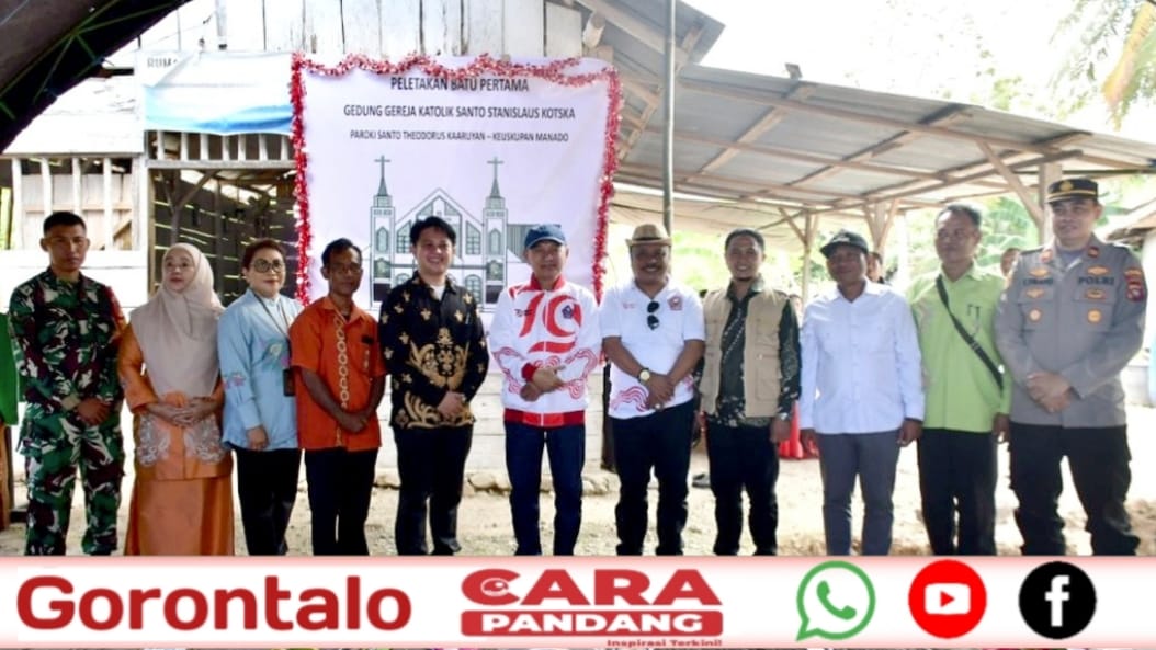 POHUWATO, CARAPANDANG - Peletakan batu pertama pembangunan Gereja Santo Stanislaus Kostka di Desa Sari Murni, Kecamatan Randangan, dihadiri langsung Bupati Pohuwato, Saipul A. Mbuinga, Pembimas Katolik Kanwil Kementerian Agama Provinsi Gorontalo, Reinne Koraag, SS. M.Si, Kakan Kemenag Pohuwato, Camat Randangan, Saharudin Saleh, Pastor Paroki Santo Theadorus Kaaruyan-Keuskupan Manado, Pastor Koresta Lila,Pr. Unsur Kesbangpol, Fathia Djubedi, unsur Polsek Randangan, Kodim 1313 Pohuwato.