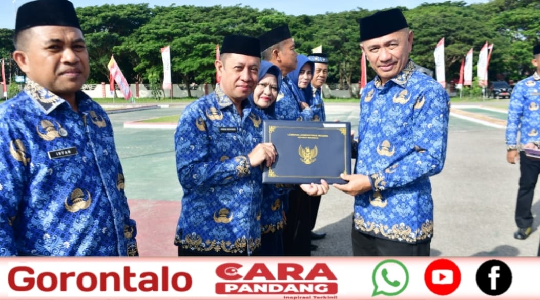 POHUWATO, CARAPANDANG - Di sela Upacara Peringatan HUT ke-53 Korpri, Bupati Pohuwato, Saipul A. Mbuinga, menyerahkan Sertifikat Pelatihan Kepemimpinan Nasional Tingkat II Angkatan XXI tahun 2024 kepada dua pejabat Pemerintah Kabupaten Pohuwato, Jum’at, (29/11/2024), di halaman kantor sementara Bupati Pohuwato.