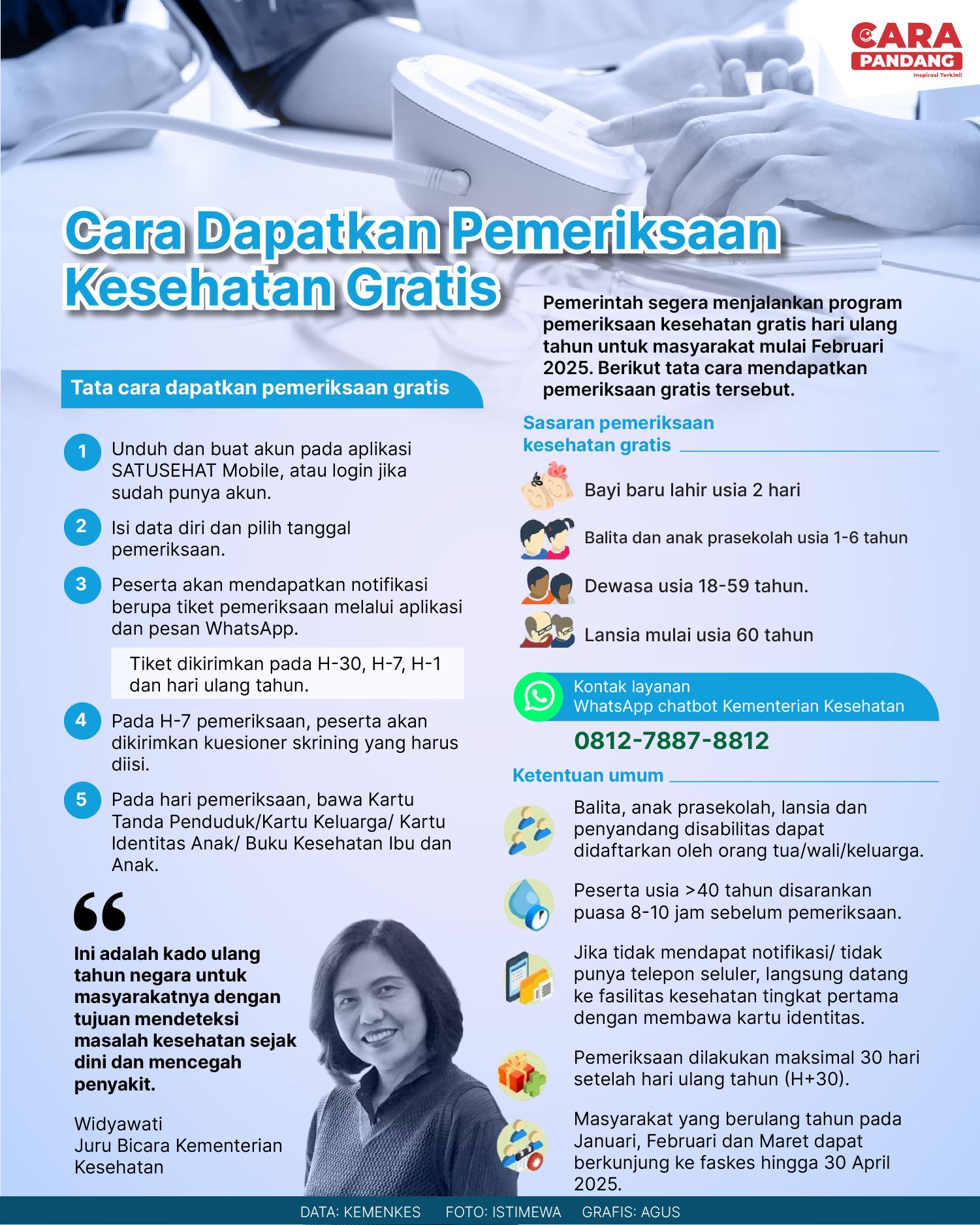 Beranda Infografis Cara Dapatkan Pemeriksaan Gratis Infografis Cara Dapatkan Pemeriksaan Gratis Penulis Amira Izzati - 02 Februari 2025 05:58 0 CARAPANDANG - Cara Dapatkan Pemeriksaan Gratis Tags Berita Sebelumnya Selamat Datang Gen Beta! Berita Berikutnya TNI AU Kerahkan A400M untuk Antar Logistik ke Lokasi Bencana Aceh LEAVE A REPLY Cancel reply Comment: Please enter your comment! Name:* Please enter your name here Email:* You have entered an incorrect email address! Please enter your email address here Website: Save my name, email, and website in this browser for the next time I comment. Berita Teratas Pemimpin Thailand dan Kamboja Berbicara via Telepon dengan Trump, Bahas Konflik Perbatasan Potret Timur Tengah: Badai Musim Dingin Tewaskan Setidaknya 14 Orang di Gaza yang Porak-Poranda akibat Perang Program Edukasi Bermain Bantu Anak Atasi Kecemasan Saat MRI Gie, Prabowo Presiden Sekarang Maruarar Sirait: Kita Samakan Data, Baru Relokasi Dan Bangun Rumah Korban Banjir Sumatera Berita Terkait Berita Terkait Distribusi Bantuan Banjir Sumatra Lewat Udara Maliq - 06 Desember 2025 14:16 Dampak Banjir Aceh, Sumut dan Sumbar Zoel Rachman - 05 Desember 2025 08:47 Daftar Dosa Korupsi Netanyahu Zoel Rachman - 04 Desember 2025 12:52 Kutipan Pidato Hari Guru Nasional 2025 Maliq - 28 November 2025 12:12