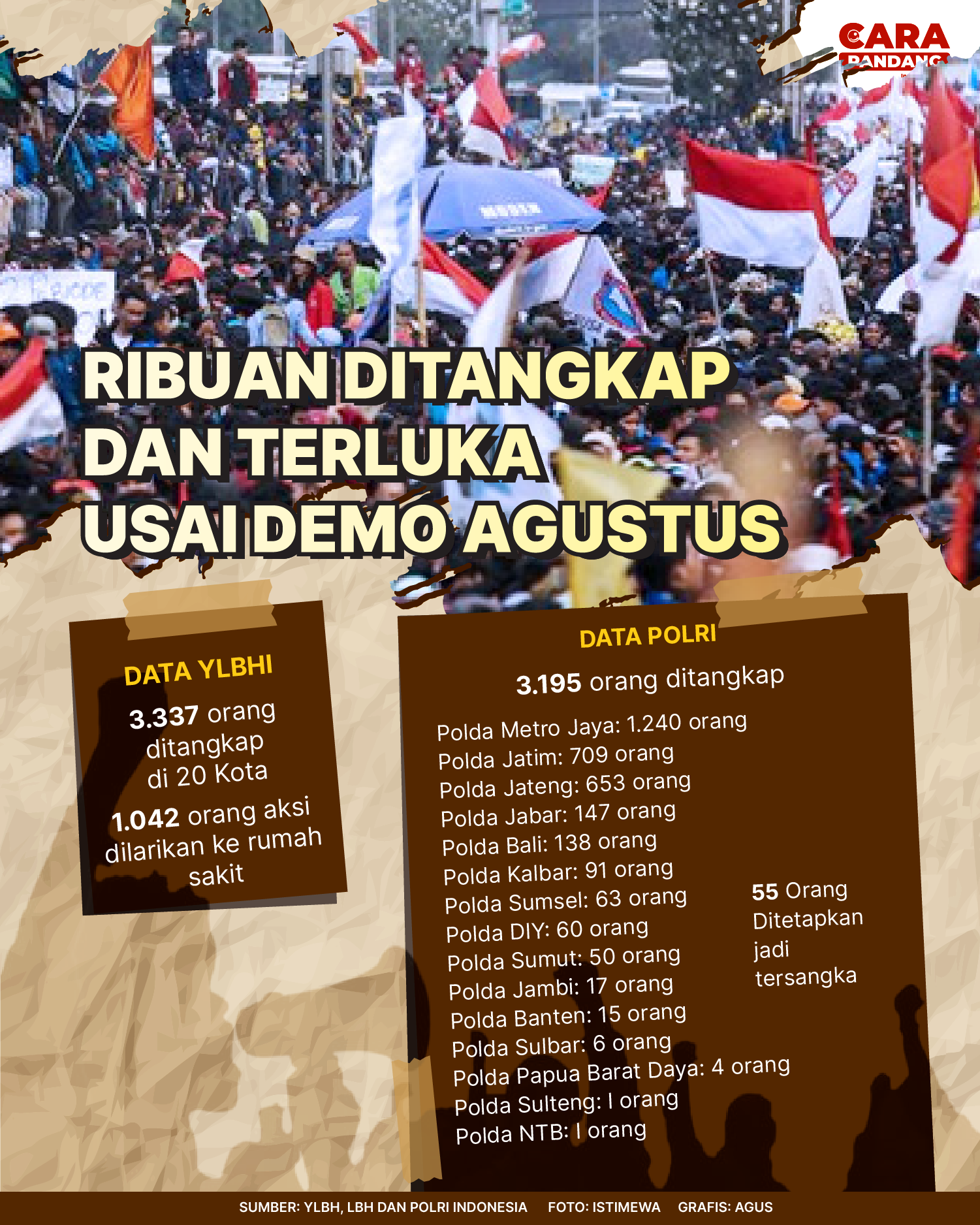 Beranda Infografis Demo Agustus, Ribuan Ditangkap dan Terluka Infografis Demo Agustus, Ribuan Ditangkap dan Terluka Penulis Amira Izzati - 06 September 2025 09:11 0 Demo Agustus, Ribuan Ditangkap dan Terluka Tags Berita Sebelumnya Wamentan: Inovasi Pupuk Indonesia yang Bikin Petani Panen Melimpah Berita Berikutnya Presiden Prabowo Lantik Tujuh Anggota KY Periode 2025-2030 LEAVE A REPLY Cancel reply Comment: Please enter your comment! Name:* Please enter your name here Email:* You have entered an incorrect email address! Please enter your email address here Website: Save my name, email, and website in this browser for the next time I comment. Berita Teratas Pemimpin Thailand dan Kamboja Berbicara via Telepon dengan Trump, Bahas Konflik Perbatasan Potret Timur Tengah: Badai Musim Dingin Tewaskan Setidaknya 14 Orang di Gaza yang Porak-Poranda akibat Perang Program Edukasi Bermain Bantu Anak Atasi Kecemasan Saat MRI Gie, Prabowo Presiden Sekarang Masakan Italia Diakui sebagai Warisan Budaya Takbenda UNESCO Berita Terkait Berita Terkait Distribusi Bantuan Banjir Sumatra Lewat Udara Maliq - 06 Desember 2025 14:16 Dampak Banjir Aceh, Sumut dan Sumbar Zoel Rachman - 05 Desember 2025 08:47 Daftar Dosa Korupsi Netanyahu Zoel Rachman - 04 Desember 2025 12:52 Kutipan Pidato Hari Guru Nasional 2025 Maliq - 28 November 2025 12:12