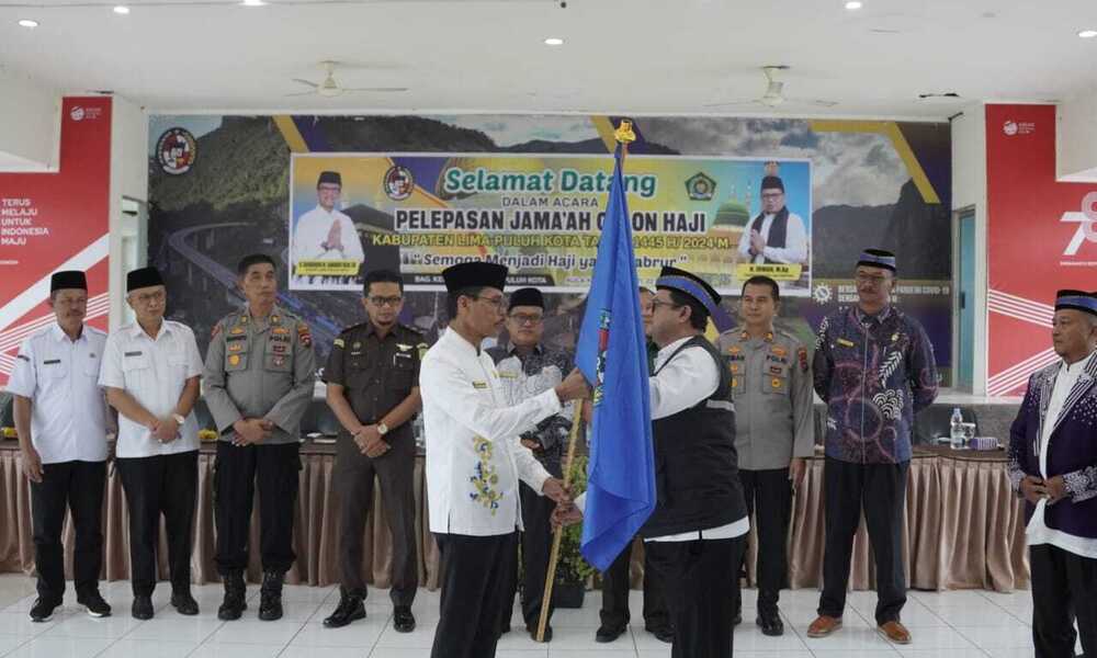 LIMA PULUH KOTA, CARAPANDANG - Labbaik Allahumma, Labbaik. Labaika Laa Syarika Laka Labbaik. Suasana bahagia dan haru terpancar dari wajah 322 Calon Jemaah (Calhaj) asal Kabupaten Limapuluh Kota kelompok terbang (kloter) XIV dan XVII, Embarkasi Padang, Sumatera Barat. Diiringi lantunan Talbiyah, Calhaj Limapuluh Kota tahun 2024/1445 Hijriyah dilepas secara resmi oleh Bupati Limapuluh Kota Safarudddin Dt.Bandaro Rajo di Aula Kantor Bupati Limapuluh Kota, Sarilamak, Rabu, (22/05/2024). Pelepasan Calhaj yang dijadwalkan terbang menuju Jedah Arab Saudi pada Selasa (27/05/2024) dan Kamis (30/05/2024) dari Bandara Internasional Minangkabau Padang Pariaman itu berlangsung khidmat. Acara pelepasan dihadiri oleh Kepala Kantor Kemenag Limapuluh Kota Irwan, unsur Forkopimda, Ketua MUI Limapuluh Kota Asrat Chan, Plt.Asisten I Eki Hari Purnama serta sejumlah Kepala Perangkat Daerah di Lingkungan Pemerintah Kabupaten Limapuluh Kota.