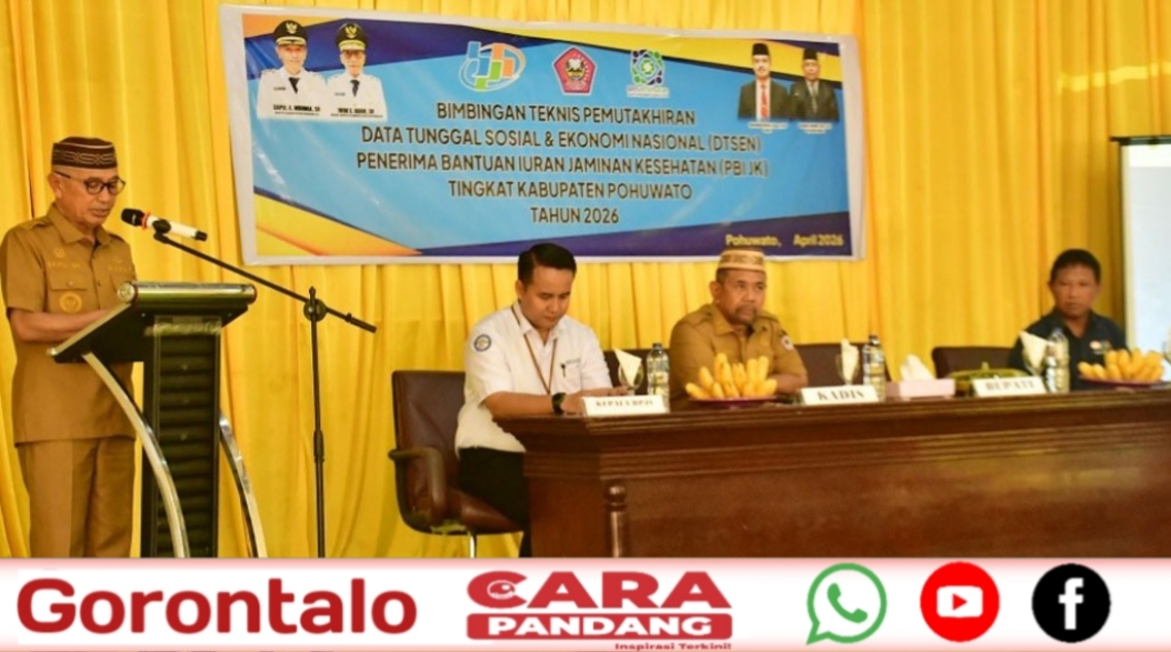 Bimtek tersebut turut dihadiri Kepala BPJS Cabang Pohuwato dan Kepala BPS Pohuwato. Pelaksanaannya mengacu pada Instruksi Presiden Nomor 4 Tahun 2025 tentang DTSEN serta Surat Keputusan Menteri Sosial Nomor 03/HUK/2026 tentang penetapan penerima Bantuan Iuran Jaminan Kesehatan (PBI JK).