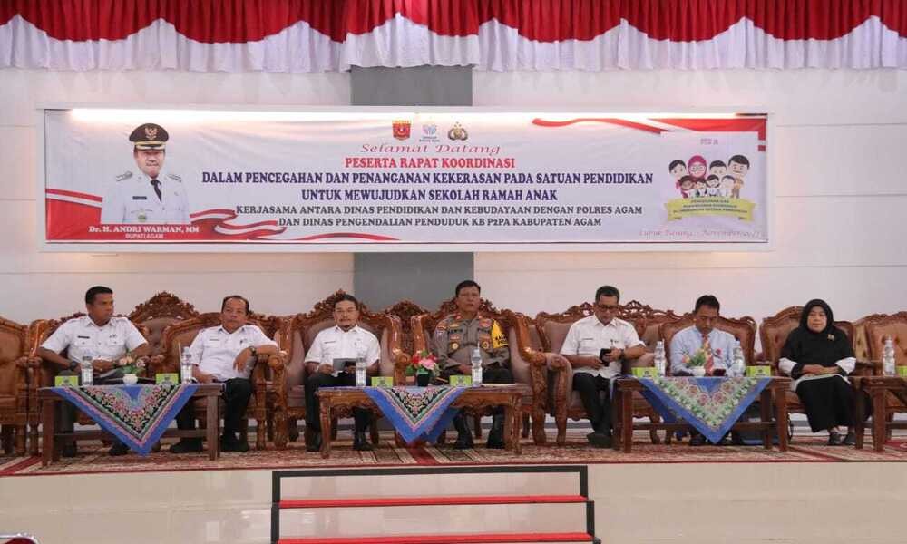 CARAPANDANG - Pemerintah Kabupaten Agam melalui Dinas Pendidikan dan Kebudayaan Kabupaten Agam bekerjasama dengan Dinas Pengendalian Penduduk KB P2PA dan Polres Agam menggelar rapat koordinasi (Rakor) dan sosialisasi dalam pencegahan dan penanganan kekerasan pada satuan pendidikan untuk mewujudkan sekolah ramah anak di Balirung Rumah Dinas Bupati Padang Baru Lubuk Basung, Rabu (1/11).