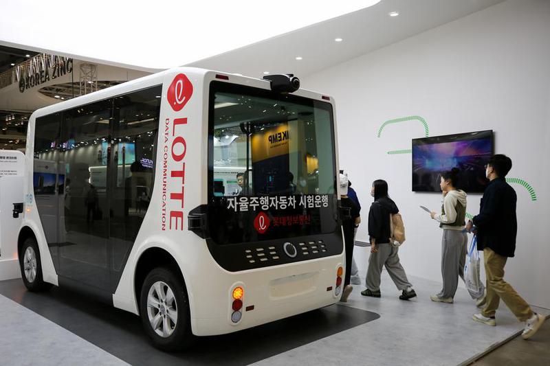 Orang-orang menghampiri sebuah kendaraan swakemudi yang dipamerkan dalam ajang World Climate Industry Expo di Busan Exhibition & Convention Center (BEXCO) di Busan, Korea Selatan, pada 25 Mei 2023. (CARAPANDANG/Xinhua/Wang Yiliang)