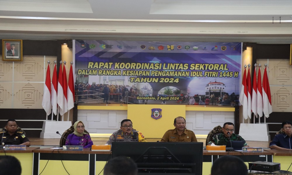 POHUWATO, CARAPANDANG - Dalam rangka kesiapan pengamanan hari raya Idul Fitri 1445 H Tahun 2024, Kepolisian Daerah Gorontalo menggelar rapat Koordinasi Lintas Sektoral bertempat di Aula Rumdis Gubernur Gorontalo, Selasa (02/4).