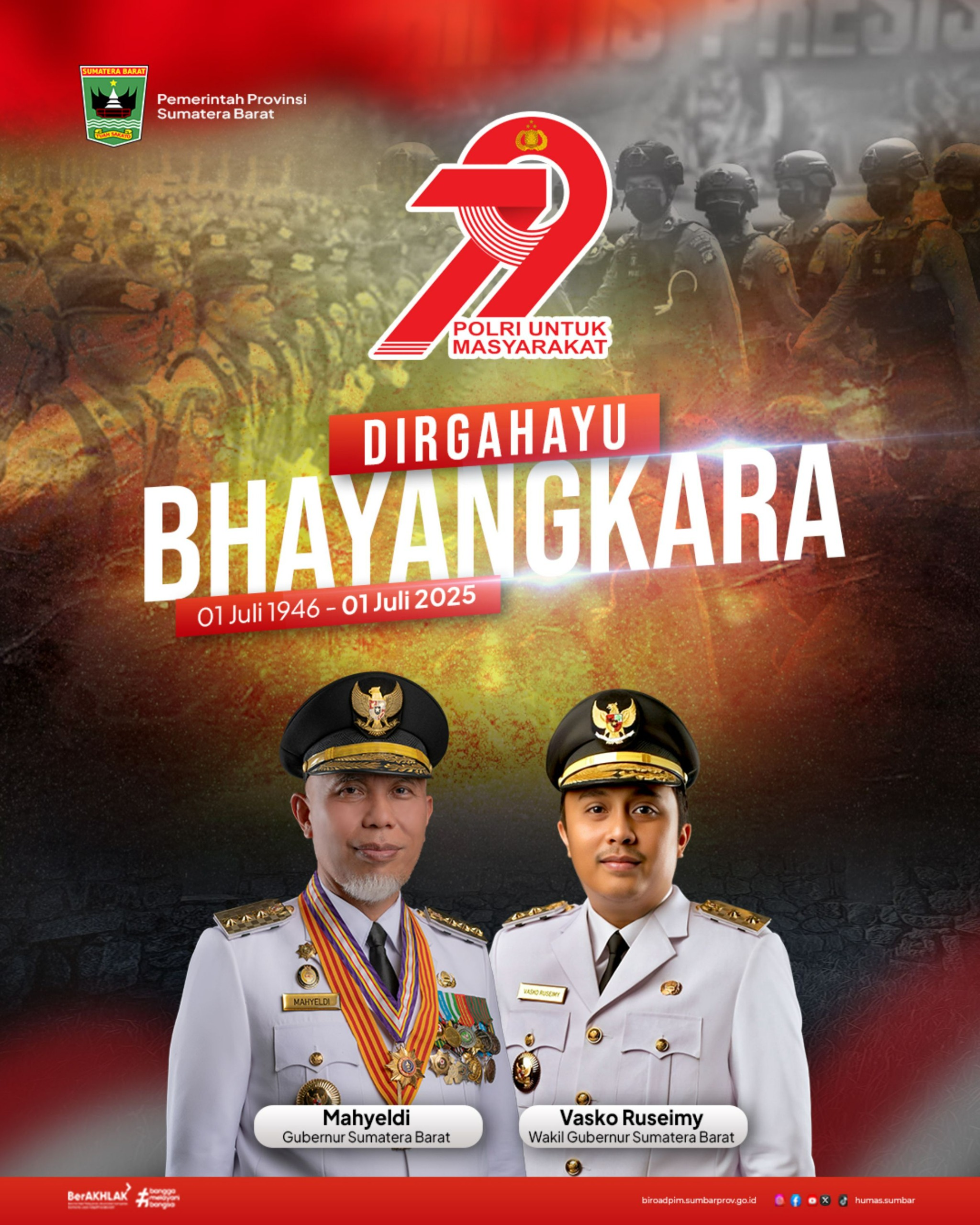 "Atas nama pemerintah dan seluruh masyarakat, saya mengucapkan Selamat Hari Bhayangkara ke-79. Terima kasih kepada seluruh insan Bhayangkara yang telah menjalankan tugas dengan penuh tanggung jawab dalam menjaga stabilitas keamanan dan kelancaran roda pembangunan di Sumbar,” ucap Gubernur Mahyeldi.