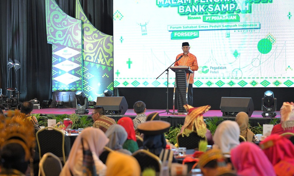 SUMBAR, CARAPANDANG.COM - Gubernur Sumatera Barat (Sumbar) Mahyeldi Ansharullah menghadiri Malam Penghargaan Bank Sampah Binaan PT Pegadaian - Forum Sahabat Emas Peduli Sampah Indonesia (Forsepsi) di The ZHM Premiere Hotel, Rabu (8/11/2023). Gubernur menyatakan apresiasinya atas inovasi dan komitmen PT Pegadaian dalam menjaga kebersihan lingkungan, mendaur ulang sampah, dan menjadikan Sumbar sebagai contoh dalam pelestarian lingkungan.