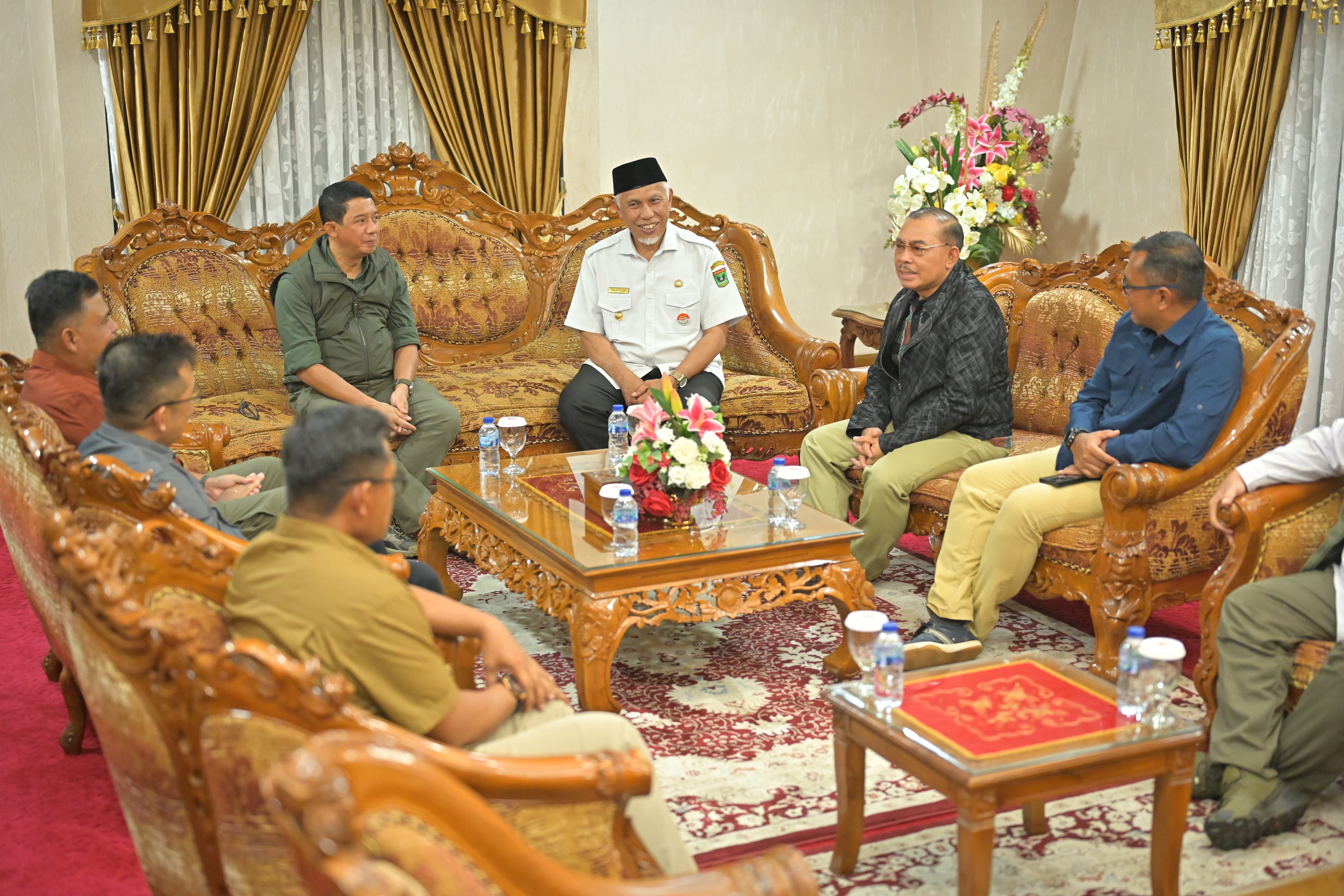 SUMBAR, CARAPANDANG - Gubernur Mahyeldi Ansharullah beserta jajaran Forkopimda Sumatera Barat (Sumbar) menyambut kedatangan Kepala BNPB, Letjen TNI Suharyanto di Bandara Internasional Minangkabau (BIM), Rabu (04/09/2024). Kedatangan Kepala BNPB ke Sumbar kali ini bertujuan untuk memimpin Apel Kesiapsiagaan terhadap potensi kebencanaan Mentawai Megathrust.