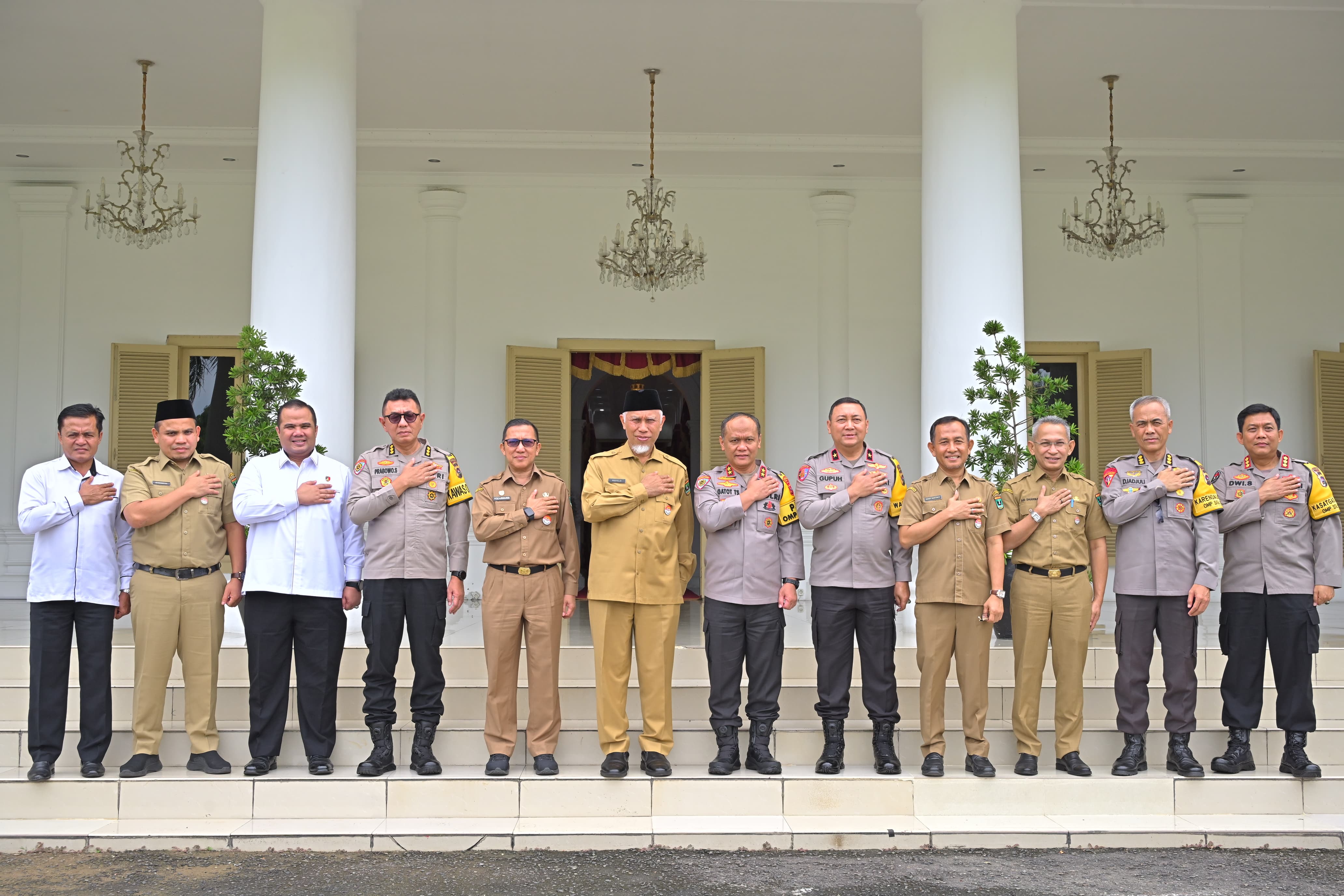 Gubernur Sumatera Barat (Sumbar), Mahyeldi Ansharullah, menerima kunjungan silaturrahim Kapolda Sumbar, Irjen Pol Gatot Tri Suryanta beserta jajaran di Istana Gubernuran, Senin (13/01/2025).