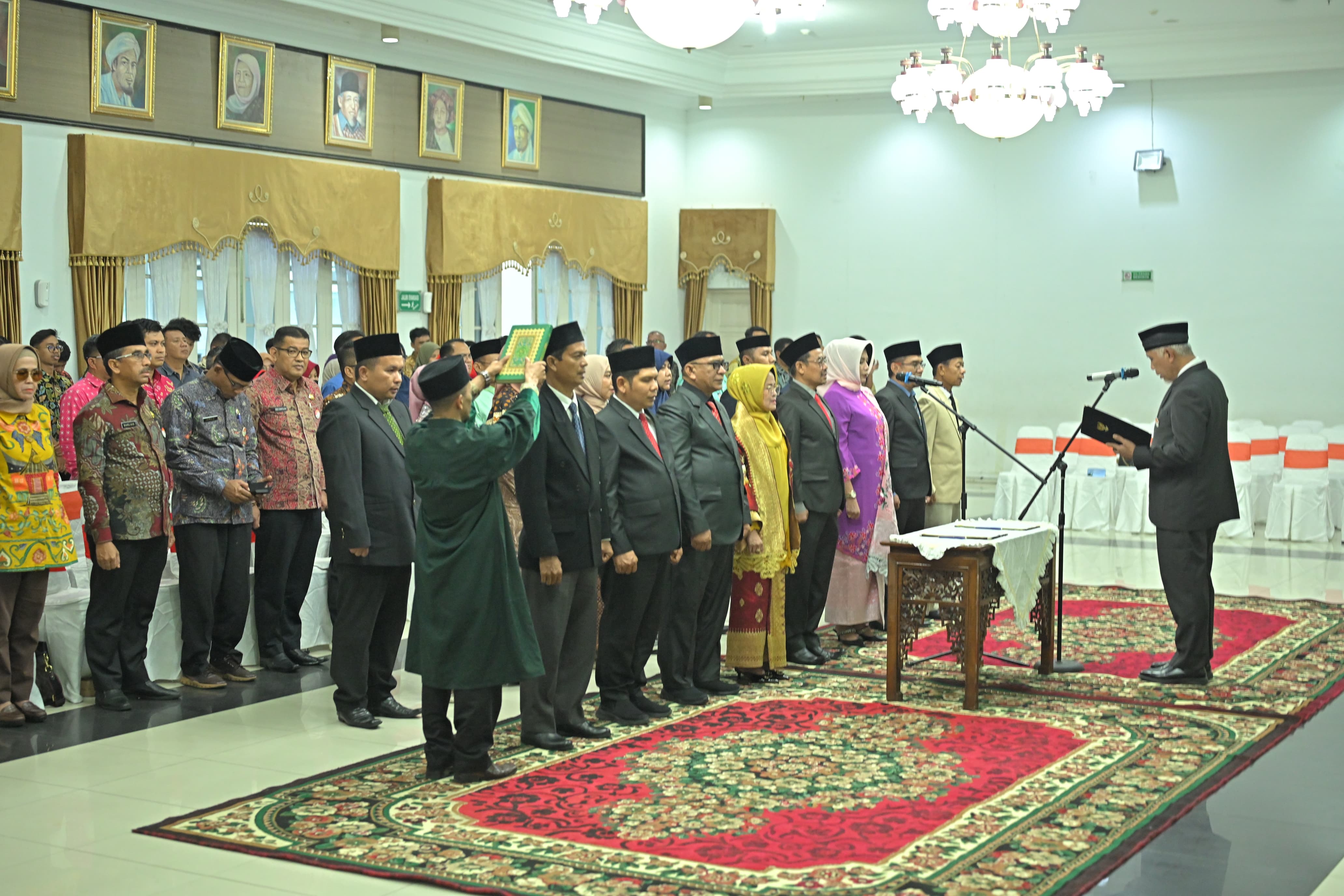 SUMBAR, CARAPANDANG - Gubernur Sumatera Barat (Sumbar), Mahyeldi Ansharullah melantik dan mengambil sumpah jabatan 18 pejabat orang pejabat Administrator dan Pejabat Pengawas di Lingkungan Pemprov Sumbar, Kamis (15/8/2024) di Auditorium Gubernuran Sumbar.