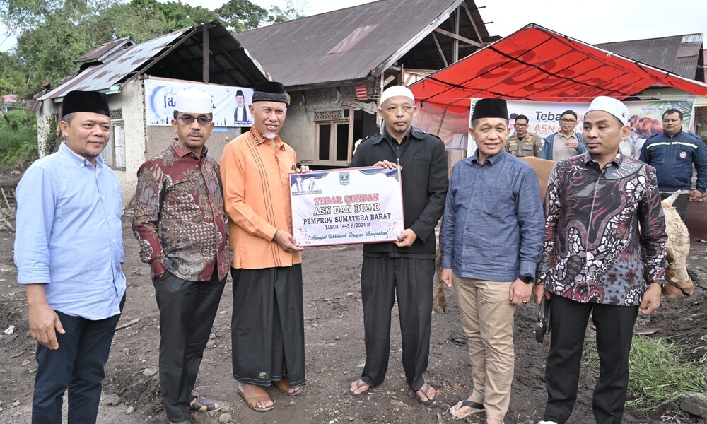 SUMBAR, CARAPANDANG - Gubernur Sumatera Barat (Sumbar) Mahyeldi Ansharullah, menyerahkan bantuan sapi qurban dalam kegiatan Tebar Qurban ASN dan BUMD Pemprov Sumbar di Nagari Parambahan, Lima Kaum, Kabupaten Tanah Datar, yang merupakan salah satu kawasan terdampak bencana, Selasa (18/06/2024). Gubernur menyatakan, ibadah qurban adalah salah satu wujud kepedulian sosial di tengah kehidupan bermasyarakat.