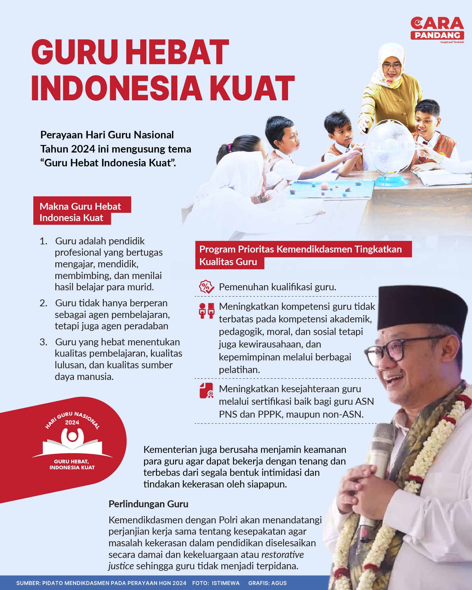 CARAPANDANG.COM - Hari Guru tahun ini mengambil tema Guru Hebat Indonesia Kuat. Tema tersebut memiliki tiga makna. Pertama, penegasan tentang arti dan kedudukan penting para guru.