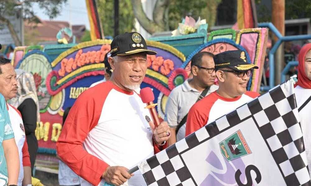 SUMBAR, CARAPANDANG.COM - Memeriahkan peringatan Hari Perhubungan Nasional (Harhubnas) Ke-53, Pemerintah Provinsi Sumatera Barat (Sumbar) menggelar kegiatan jalan santai bersama masyarakat di Padang, Minggu (17/9/2023). Jelang pelepasan peserta, Gubernur Sumbar, Mahyeldi Ansharullah menyampaikan komitmennya untuk memajukan ekosistem transportasi publik di Sumbar, dengan mengedepankan sisi keamanan dan kenyamanan pengguna.