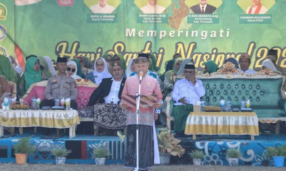 POHUWATO, CARAPANDANG.COM - Bupati Pohuwato Saipul A Mbuinga, di lapangan Buntulia Utara, Kecamatan Buntulia, Kabupaten Pohuwato, pada Ahad (22/10/2023), hadir dalam apel Akbar Hari Santri Nasional (HSN).