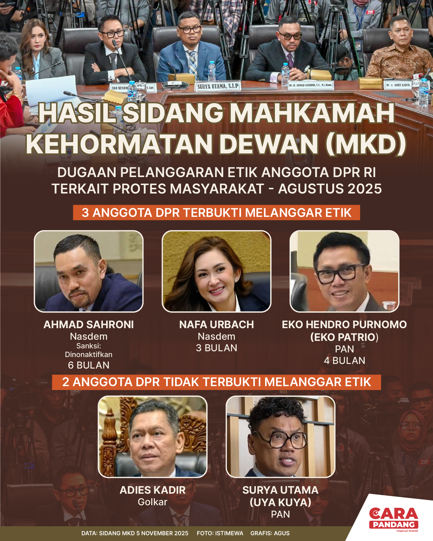 Beranda Infografis Hasil Sidang MKD DPR RI Infografis Hasil Sidang MKD DPR RI Penulis Amira Izzati - 06 November 2025 11:34 0 Hasil Sidang MKD DPR RI Tags Berita Sebelumnya Biaya Haji 2026 Turun Berita Berikutnya Wamenhan: KRI Balaputradewa-322 Buatan PT PAL Miliki Presisi Tinggi LEAVE A REPLY Cancel reply Comment: Please enter your comment! Name:* Please enter your name here Email:* You have entered an incorrect email address! Please enter your email address here Website: Save my name, email, and website in this browser for the next time I comment. Berita Teratas Delapan Emas Lahir dari Tim Indonesia pada Hari Ketiga Pemimpin Thailand dan Kamboja Berbicara via Telepon dengan Trump, Bahas Konflik Perbatasan Program Edukasi Bermain Bantu Anak Atasi Kecemasan Saat MRI Potret Timur Tengah: Badai Musim Dingin Tewaskan Setidaknya 14 Orang di Gaza yang Porak-Poranda akibat Perang Maruarar Sirait: Kita Samakan Data, Baru Relokasi Dan Bangun Rumah Korban Banjir Sumatera Berita Terkait Berita Terkait Distribusi Bantuan Banjir Sumatra Lewat Udara Maliq - 06 Desember 2025 14:16 Dampak Banjir Aceh, Sumut dan Sumbar Zoel Rachman - 05 Desember 2025 08:47 Daftar Dosa Korupsi Netanyahu Zoel Rachman - 04 Desember 2025 12:52 Kutipan Pidato Hari Guru Nasional 2025 Maliq - 28 November 2025 12:12