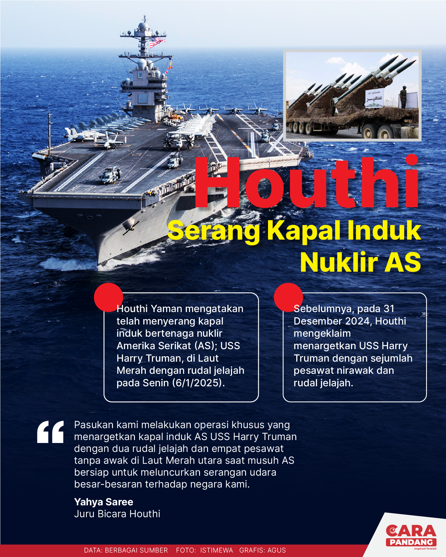 Beranda Infografis Houthi Serang Kapal Induk Nuklir AS Infografis Houthi Serang Kapal Induk Nuklir AS Penulis Amira Izzati - 10 Januari 2025 06:30 0 CARAPANDANG - Houthi serang kapal induk nuklir AS Tags Berita Sebelumnya Prakiraan Cuaca Indonesia 10 Januari 2025 Berita Berikutnya Para Tahanan Pro-Palestina yang Mogok Makan di Inggris Hadapi Risiko Kematian LEAVE A REPLY Cancel reply Comment: Please enter your comment! Name:* Please enter your name here Email:* You have entered an incorrect email address! Please enter your email address here Website: Save my name, email, and website in this browser for the next time I comment. Berita Teratas Pemimpin Thailand dan Kamboja Berbicara via Telepon dengan Trump, Bahas Konflik Perbatasan Potret Timur Tengah: Badai Musim Dingin Tewaskan Setidaknya 14 Orang di Gaza yang Porak-Poranda akibat Perang Program Edukasi Bermain Bantu Anak Atasi Kecemasan Saat MRI Gie, Prabowo Presiden Sekarang Maruarar Sirait: Kita Samakan Data, Baru Relokasi Dan Bangun Rumah Korban Banjir Sumatera Berita Terkait Berita Terkait Distribusi Bantuan Banjir Sumatra Lewat Udara Maliq - 06 Desember 2025 14:16 Dampak Banjir Aceh, Sumut dan Sumbar Zoel Rachman - 05 Desember 2025 08:47 Daftar Dosa Korupsi Netanyahu Zoel Rachman - 04 Desember 2025 12:52 Kutipan Pidato Hari Guru Nasional 2025 Maliq - 28 November 2025 12:12