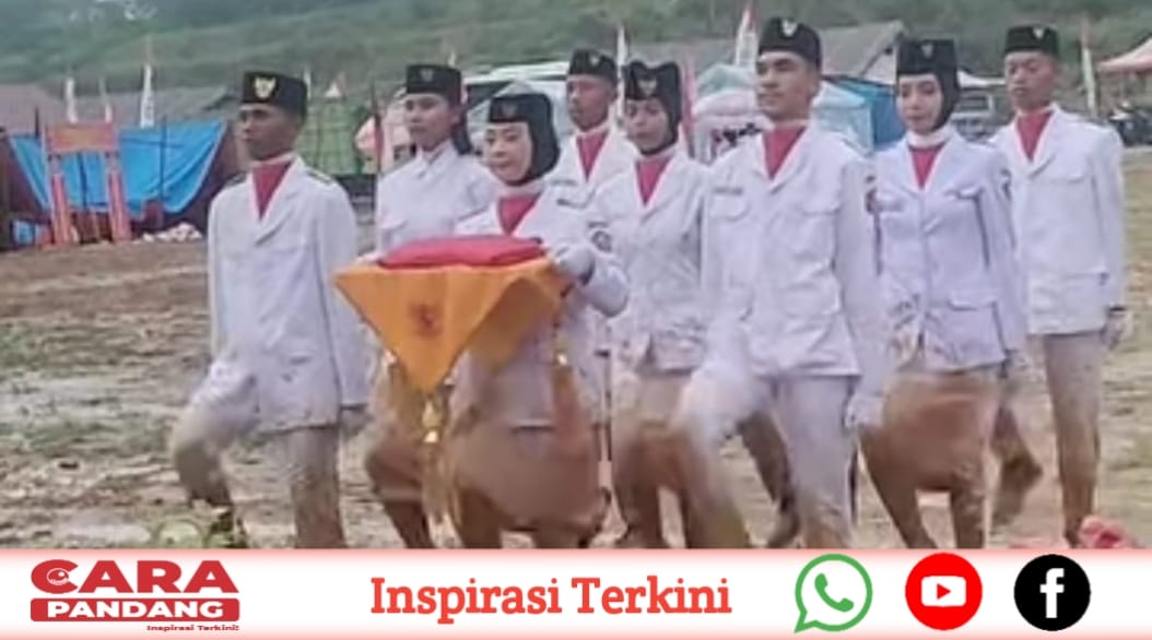 POHUWATO, CARAPANDANG - Hujan deras yang mengguyur Kecamatan Taluditi, Kabupaten Pohuwato, Minggu sore (17/8/2025), tidak mampu meredam semangat nasionalisme para Pasukan Pengibar Bendera (Paskibra) dalam upacara penurunan Sang Saka Merah Putih di Lapangan Puncak Jaya.