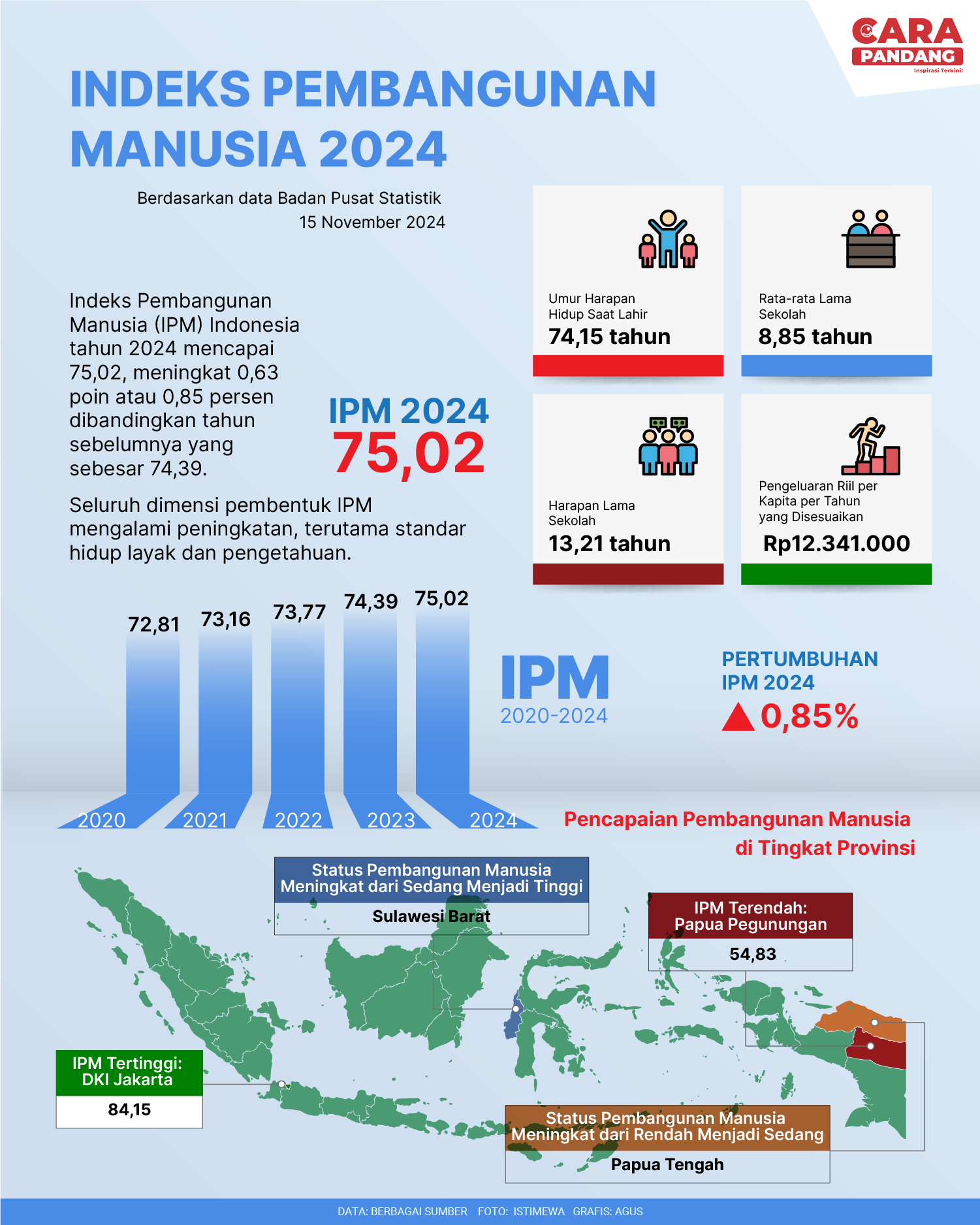 deks Pembangunan Manusia (IPM) Indonesia tahun 2024 mencapai 75,02, meningkat 0,63 poin atau 0,85 persen dibandingkan tahun sebelumnya yang sebesar 74,39.