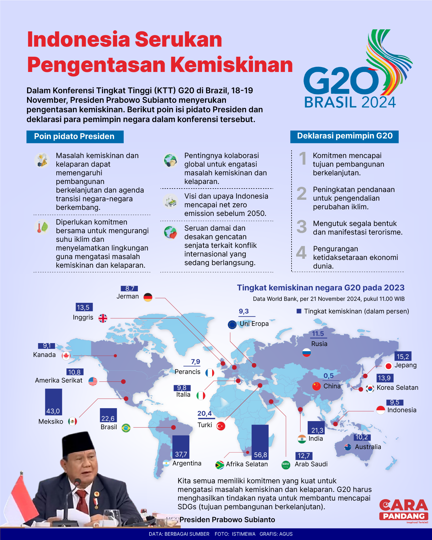 Dalam Konferensi Tingkat Tinggi (KTT) G20 di Brazil, 18-19 November, Presiden Prabowo Subianto menyerukan pengentasan kemiskinan.