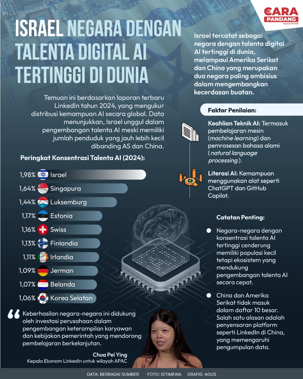 Beranda Infografis Israel, Negara dengan Talenta AI Tertinggi di Dunia Infografis Israel, Negara dengan Talenta AI Tertinggi di Dunia Penulis Amira Izzati - 22 April 2025 14:51 0 CARAPANDANG - Israel, Negara dengan Talenta AI Tertinggi di Dunia Tags Berita Sebelumnya Pendaftaran Ujian Masuk PTKIN Dibuka Berita Berikutnya Presiden Prabowo Lantik Tujuh Anggota KY Periode 2025-2030 LEAVE A REPLY Cancel reply Comment: Please enter your comment! Name:* Please enter your name here Email:* You have entered an incorrect email address! Please enter your email address here Website: Save my name, email, and website in this browser for the next time I comment. Berita Teratas Pemimpin Thailand dan Kamboja Berbicara via Telepon dengan Trump, Bahas Konflik Perbatasan Potret Timur Tengah: Badai Musim Dingin Tewaskan Setidaknya 14 Orang di Gaza yang Porak-Poranda akibat Perang Program Edukasi Bermain Bantu Anak Atasi Kecemasan Saat MRI Gie, Prabowo Presiden Sekarang Masakan Italia Diakui sebagai Warisan Budaya Takbenda UNESCO Berita Terkait Berita Terkait Distribusi Bantuan Banjir Sumatra Lewat Udara Maliq - 06 Desember 2025 14:16 Dampak Banjir Aceh, Sumut dan Sumbar Zoel Rachman - 05 Desember 2025 08:47 Daftar Dosa Korupsi Netanyahu Zoel Rachman - 04 Desember 2025 12:52 Kutipan Pidato Hari Guru Nasional 2025 Maliq - 28 November 2025 12:12