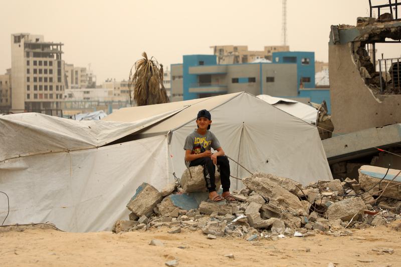 Seorang anak duduk di depan tenda para pengungsi di sebuah tempat penampungan sementara di Gaza City pada 30 April 2025. (Xinhua/Rizek Abdeljawad)