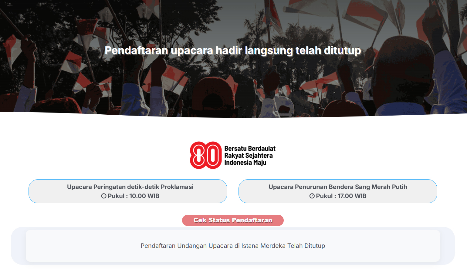 Para pendaftar, yang merupakan masyarakat umum, diberi kesempatan untuk memilih menghadiri salah satu dari dua pilihan upacara di Istana Merdeka, yaitu Upacara Peringatan Detik-Detik Proklamasi pada pukul 10.00 WIB, dan Upacara Penurunan Bendera Sang Merah Putih pada pukul 17.00 WIB.