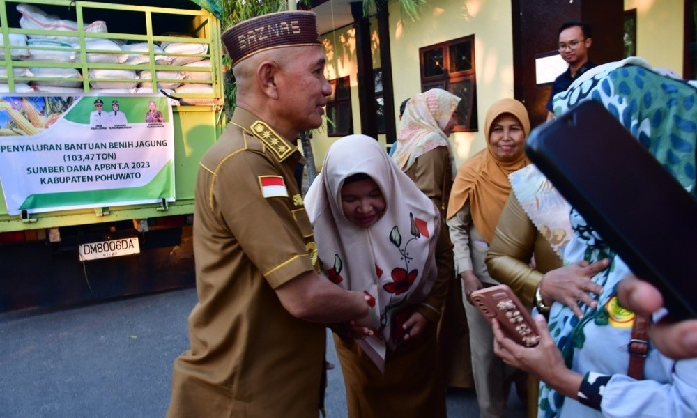 POHUWATO, CARAPANDANG.COM - Berkunjung ke Dinas Pertanian dalam rangka pelepasan bantuan benih jagung hibrida, Bupati Pohuwato, Saipul A. Mbuinga disambut jajaran ASN. Terlihat, para pegawai yang terdiri dari PNS dan honorer itu menyambut kedatangan bupati serta menyalami, Selasa, (26/9/2023).