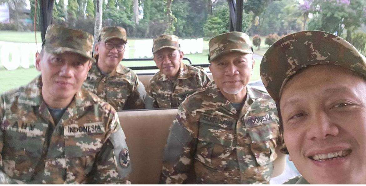 Potret anggota kabinet memakai seragam loreng diunggah Wakil Menteri Lingkungan Hidup Diaz Hendropriyono. Diaz berfoto dengan sejumlah menteri lainnya.