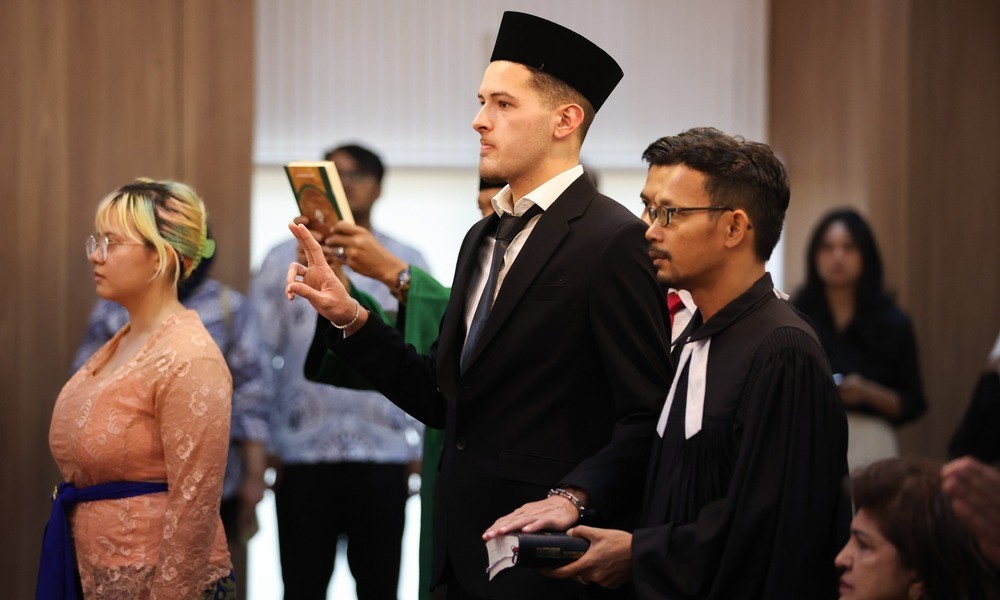 Mengenakan setelan jas, dasi, dan kopiah berwarna hitam, Hubner, beserta sejumlah calon WNI, mengikuti prosesi pengambilan sumpah yang dipimpin oleh Kepala Kanwil Kemenkumham DKI Jakarta, Ibnu Chuldun.
