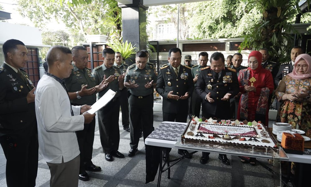 “Sebelumnya, kami (Pangdam, red) beserta keluarga dan pejabat utama Kodam mengucapkan selamat HUT Bhayangkara,” ujar Pangdam sebelum melakukan prosesi pemotongan kue.