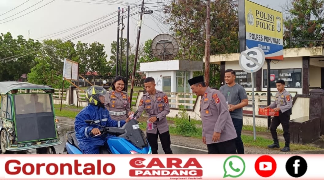 Dalam kegiatan tersebut, AKBP Winarno dan Iptu Novika Veronika bersama personel membagikan Takjil kepada masyarakat yang melintas tepatnya di simpang empat depan pos Kawasan Tertib Lalu Lintas, sebagai bentuk kepedulian Polres Pohuwato terhadap masyarakat yang sedang melaksanakan Ibadah puasa di bulan suci Ramadhan 1446 H.
