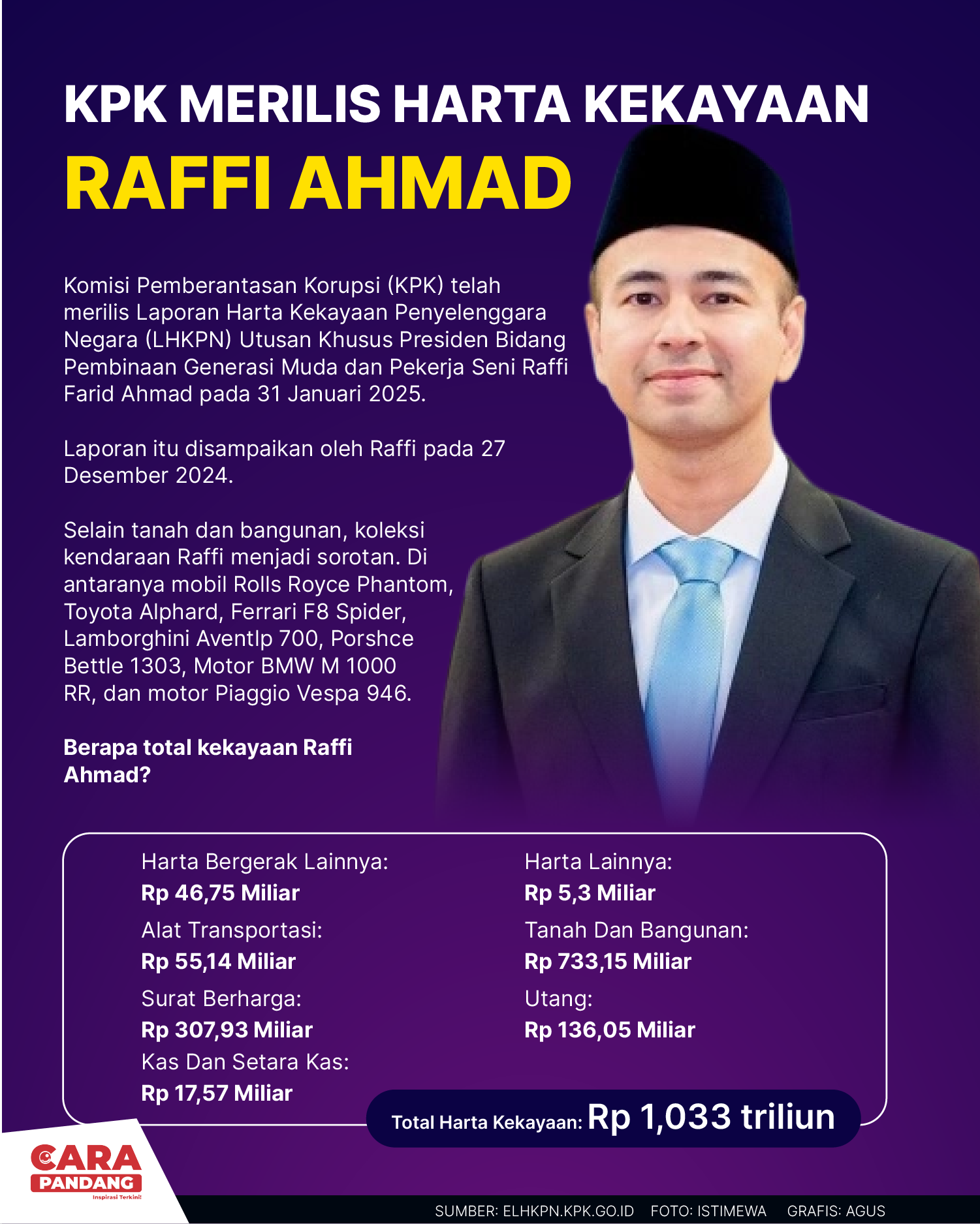 Beranda Infografis Kekayaan Raffi Ahmad Infografis Kekayaan Raffi Ahmad Penulis Amira Izzati - 06 Februari 2025 12:22 0 CARAPANDANG - Kekayaan Raffi Ahmad Tags Berita Sebelumnya Thailand Putus PAsokan Listrik ke Lima Kota di Myanmar Berita Berikutnya TNI AU Kerahkan A400M untuk Antar Logistik ke Lokasi Bencana Aceh LEAVE A REPLY Cancel reply Comment: Please enter your comment! Name:* Please enter your name here Email:* You have entered an incorrect email address! Please enter your email address here Website: Save my name, email, and website in this browser for the next time I comment. Berita Teratas Pemimpin Thailand dan Kamboja Berbicara via Telepon dengan Trump, Bahas Konflik Perbatasan Potret Timur Tengah: Badai Musim Dingin Tewaskan Setidaknya 14 Orang di Gaza yang Porak-Poranda akibat Perang Program Edukasi Bermain Bantu Anak Atasi Kecemasan Saat MRI Maruarar Sirait: Kita Samakan Data, Baru Relokasi Dan Bangun Rumah Korban Banjir Sumatera Gie, Prabowo Presiden Sekarang Berita Terkait Berita Terkait Distribusi Bantuan Banjir Sumatra Lewat Udara Maliq - 06 Desember 2025 14:16 Dampak Banjir Aceh, Sumut dan Sumbar Zoel Rachman - 05 Desember 2025 08:47 Daftar Dosa Korupsi Netanyahu Zoel Rachman - 04 Desember 2025 12:52 Kutipan Pidato Hari Guru Nasional 2025 Maliq - 28 November 2025 12:12
