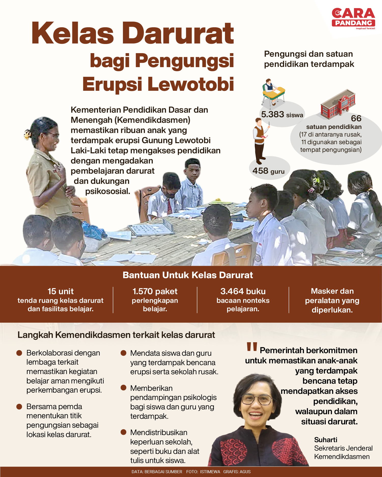 Kementerian Pendidikan Dasar dan Menengah (Kemendikdasmen) memastikan ribuan anak yang terdampak erupsi Gunung Lewotobi Laki Laki tetap mengakses pendidikan dengan mengadakan pembelajaran darurat dan dukungan psikososial.