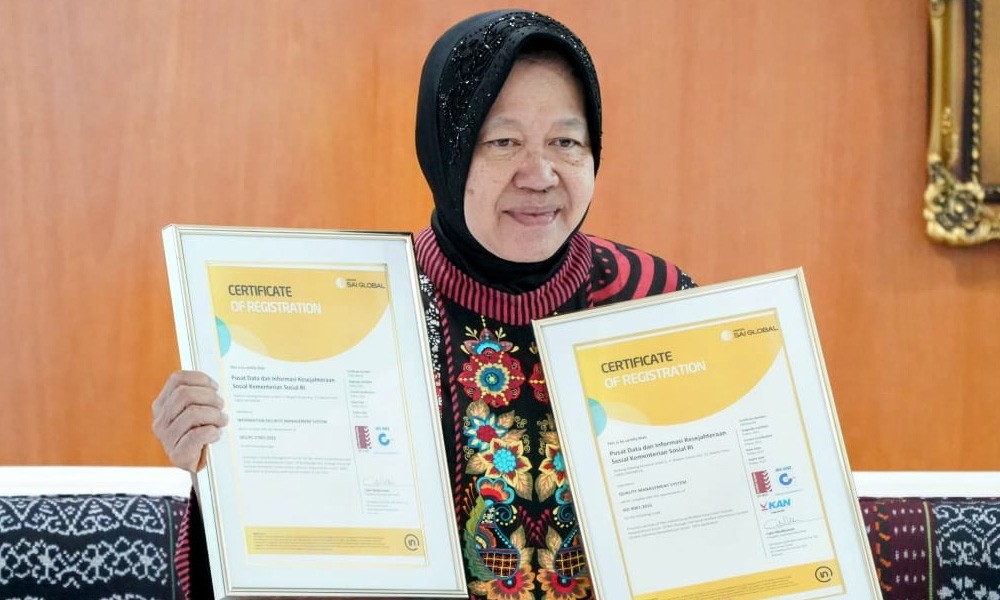 CARAPANDANG - Kementerian Sosial melalui Pusat Data dan Informasi Kesejahteraan Sosial (Pusdatin Kesos) Kemensos RI memperoleh dua sertifikat ISO (International Standardization Organization) yaitu ISO/IEC 27001:2022 tentang Sistem Manajemen Keamanan Data dan ISO 9001:2015 tentang Sistem Manajemen Mutu.