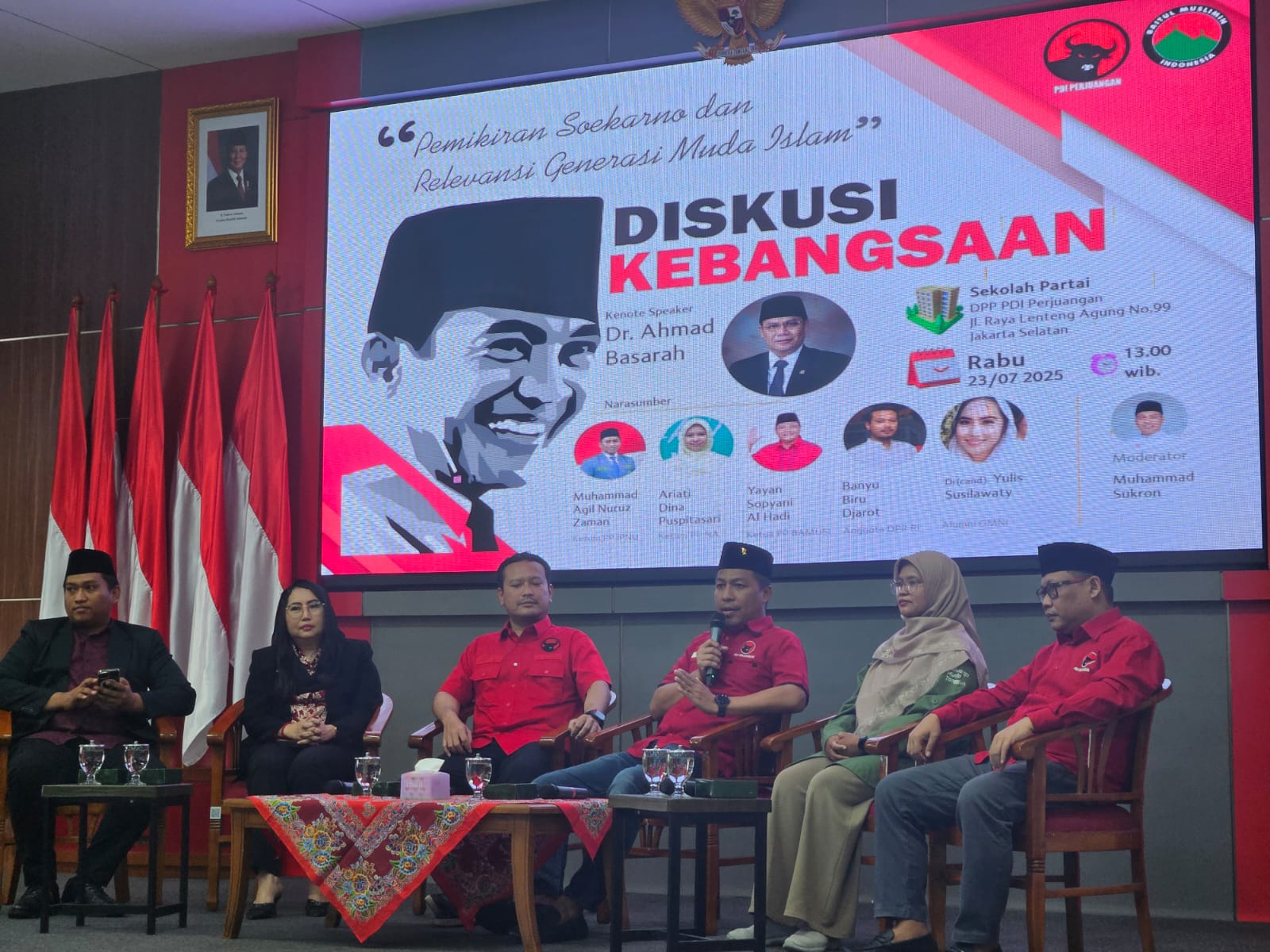 CARAPANDANG - Ratusan orang dari berbagai elemen mahasiswa, NU, Muhammadiyah menghadiri acara Baitul Muslimin Indonesia (BAMUSI) dengan tema Pemikiran Soekarno dan Relevansi Generasi Muda Islam di Gedung Sekolah Partai DPP PDI Perjuangan Lenteng Agung, Rabu 23 Juli 2025.
