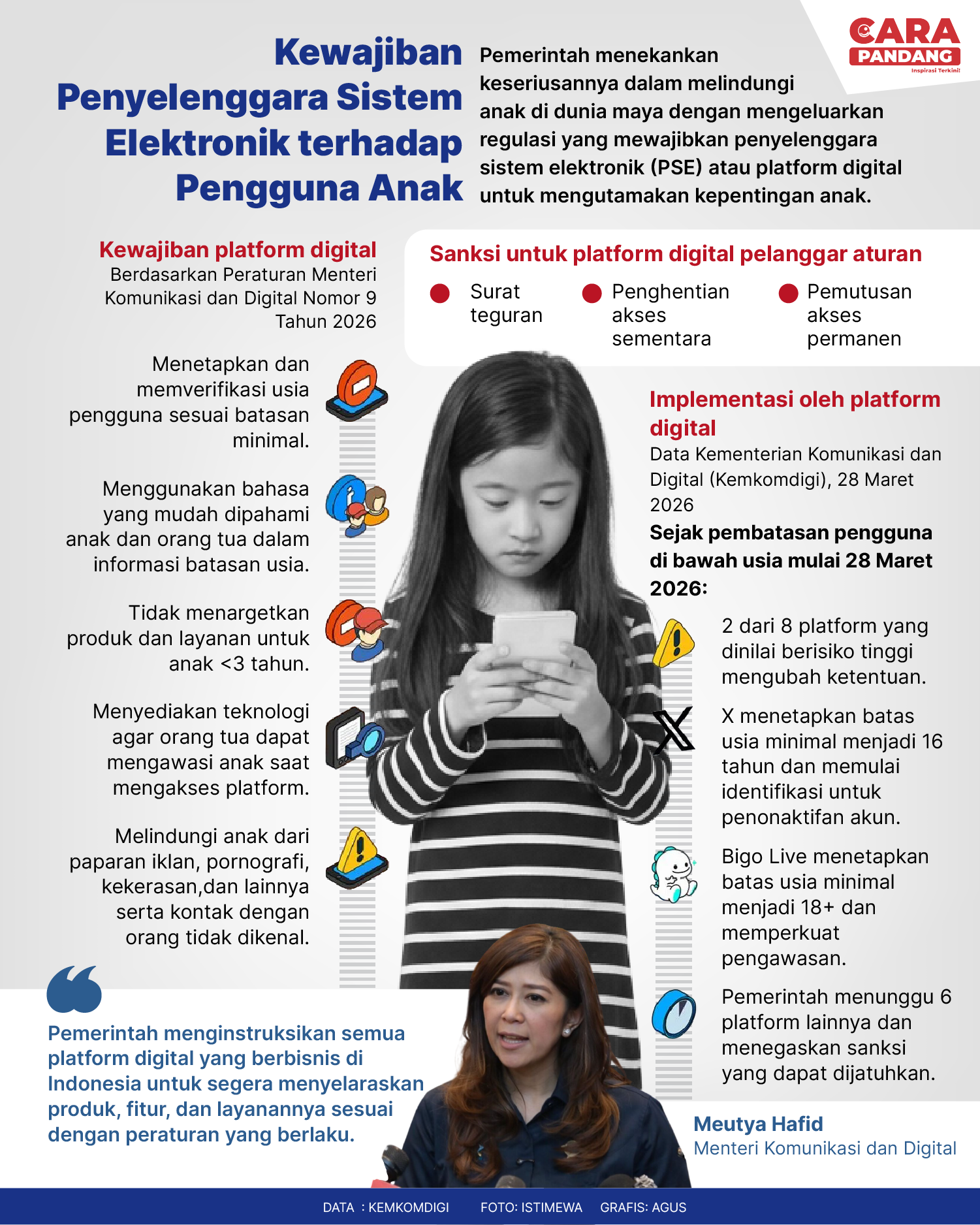Beranda Infografis Kewaijiban PSE Terhadap Pengguna Anak Infografis Kewaijiban PSE Terhadap Pengguna Anak Penulis Amira Izzati - 30 Maret 2026 11:15 0 Kewaijiban PSE Terhadap Pengguna Anak Tags Berita Sebelumnya Trump: AS telah Ambil Langkah untuk Kuasai Selat Hormuz Berita Berikutnya Polri Berhasil Bongkar Keberadaan Pabrik Whip Pink LEAVE A REPLY Cancel reply Comment: Please enter your comment! Name:* Please enter your name here Email:* You have entered an incorrect email address! Please enter your email address here Website: Save my name, email, and website in this browser for the next time I comment. Berita Teratas Cara Tidur Ala Rasulullah, Bagus untuk Kesehatan! Mengunjungi Museum Lokananta di Surakarta, Jawa Tengah Pengamat: Melihat Kebijakan WFH Pada Hari Jumat Sebagai langkah positif Biografi B.J Habibie: Bapak Teknologi Indonesia yang Hebat dan Mengharumkan Nama Bangsa Chrisye: Sang Legenda Musik Indonesia,Inspiratif dan Tak Pernah Padam Ditelan Waktu Berita Terkait Berita Terkait Rapor Biru Kinerja Kabinet Merah Putih Maliq - 15 April 2026 14:46 Makin Ugal-ugalan Kini BGN Gelontorkan 6,9 Miliar untuk Belanja Kaos Kaki Zoel Rachman - 13 April 2026 07:53 Wajah Baru PP Tunas: Garda Terdepan Perlindungan Anak Indonesia Zoel Rachman - 31 Maret 2026 09:42 MBG 5 Hari Sepekan Masih Wacana Maliq - 30 Maret 2026 11:49