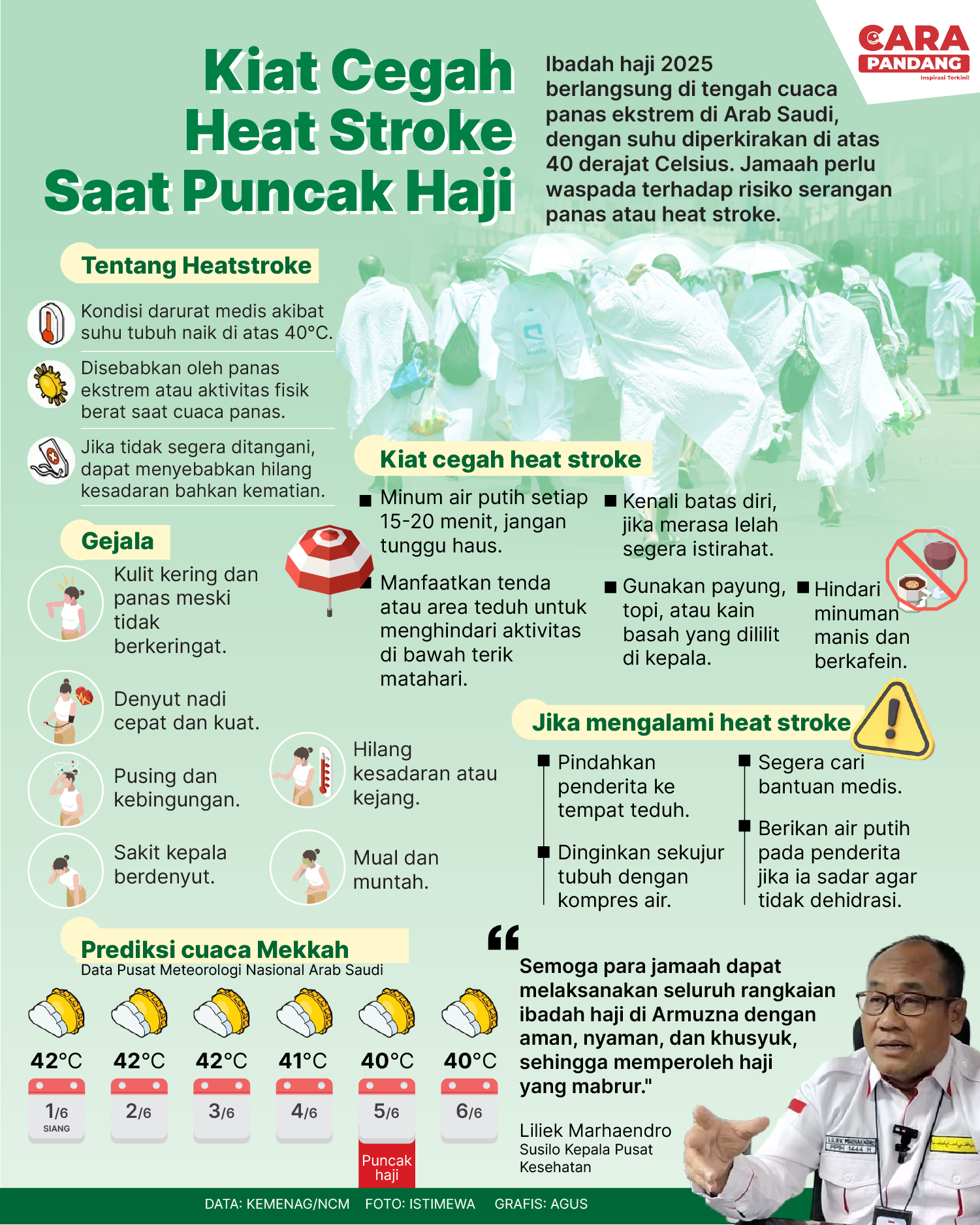 CARAPANDANG.COM- Ibadah Haji 2025 berlangsung di tengah cuaca panas ekstrem di Arab Saudi, dengan suhu diperkirakan diatas 40 derjat Celsius. Jamaah perlu waspada terhadap risiko serangan panas atau head stroke.