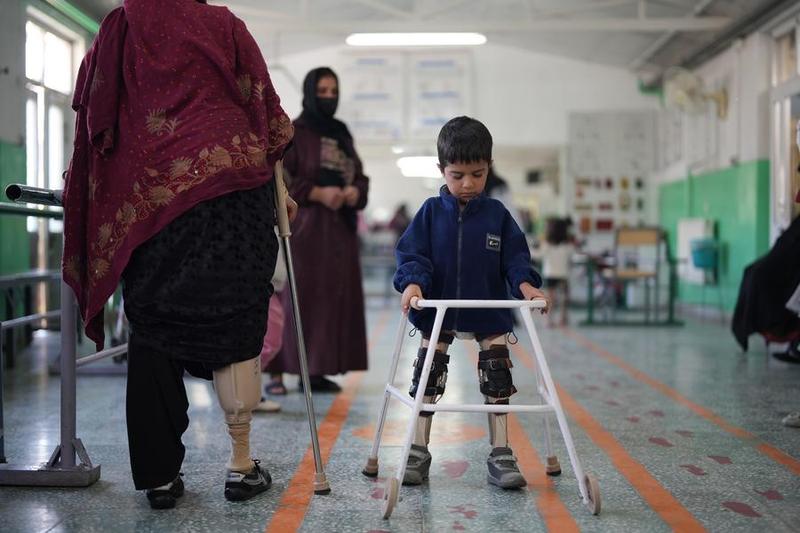 Sejumlah pengguna kaki palsu berlatih dalam sesi fisioterapi di pusat rehabilitasi yang dijalankan oleh Komite Palang Merah Internasional (International Committee of the Red Cross/ICRC) di Kabul, Afghanistan, pada 26 November 2024. (Xinhua/Li Ang)