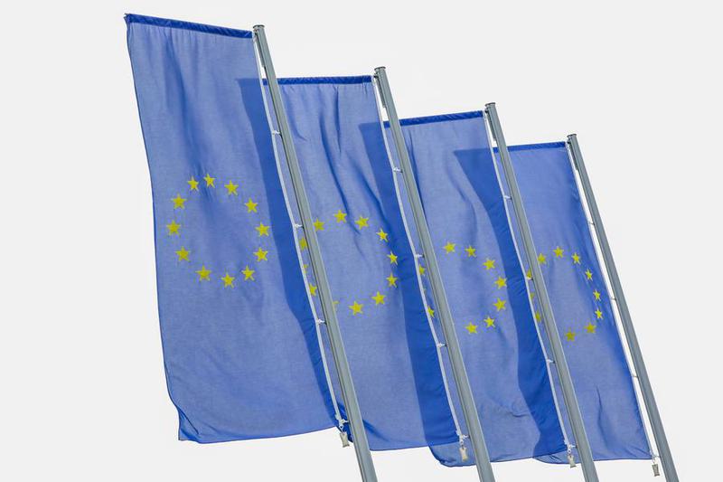 Foto yang diabadikan pada 17 April 2025 ini memperlihatkan bendera Uni Eropa (UE) di depan kantor pusat Bank Sentral Eropa (European Central Bank/ECB) di Frankfurt, Jerman. (Xinhua/Zhang Fan)