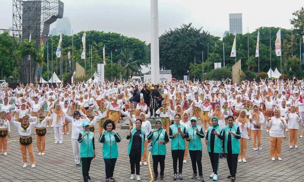 CARAPANDANG - Kementerian Pemuda dan Olahraga Republik Indonesia (Kemenpora RI) bekerja sama Dharma Wanita Persatuan (DWP) Pusat menggelar Lomba Senam Kesegaran Jasmani (SKJ) Massal, Jumat (1/12) pagi di halaman Graha Kemenpora, Jalan Gerbang Pemuda Nomor 3 Senayan, Jakarta.