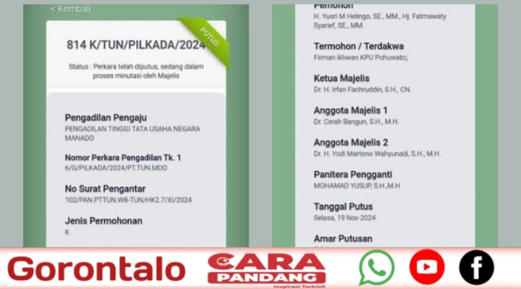 Informasi ini diterima oleh Komisi Pemilihan Umum (KPU) Pohuwato melalui kuasa hukum mereka, Yakop Mahmud & Partners Law Firm, berdasarkan portal informasi perkara MA.