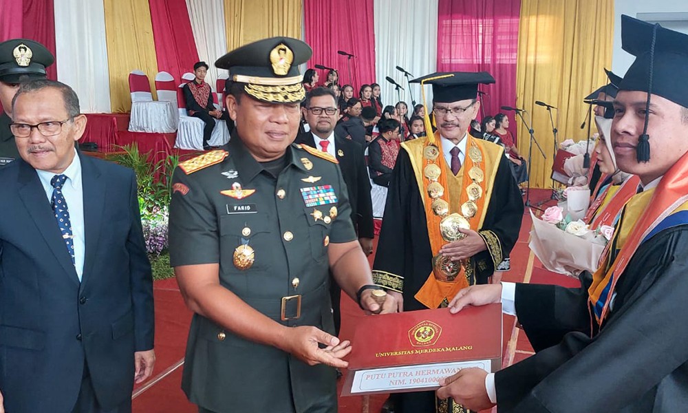Wisuda Program Diploma, Sarjana dan Pasca Sarjana yang berlangsung di Universitas Merdeka, Kota Malang, Jawa Timur pada Minggu (28/05/2023) turut dihadiri oleh Pangdam V/Brawijaya, Mayjen TNI Farid Makruf.