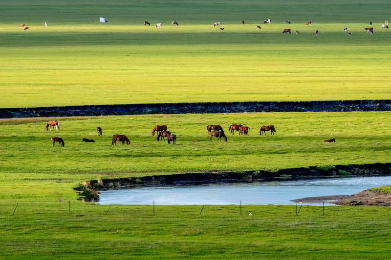 Di awal musim gugur, Sungai Mergel Gol di Hulun Buir, Daerah Otonom Mongolia Dalam, China utara, mengalir tenang membelah padang rumput yang luas. Sapi, domba, dan kuda merumput dan berkeliaran bebas di sepanjang tepiannya, menyatu dengan hamparan padang rumput yang tenang dan indah.