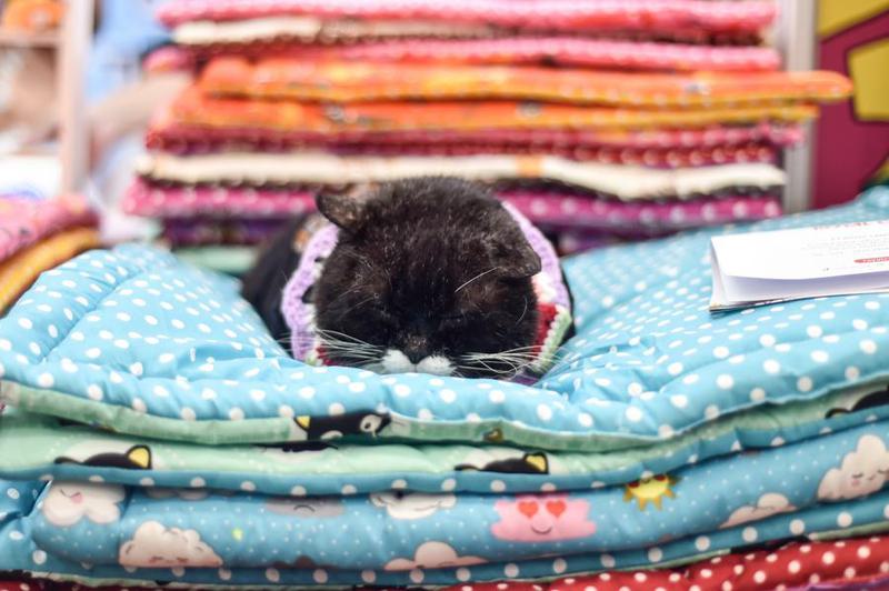 Seekor kucing terlihat tidur di atas tumpukan selimut dalam ajang Pet Fest 2025 di Kabupaten Tangerang, Provinsi Banten, pada 4 Mei 2025. (Xinhua/Agung Kuncahya B.)