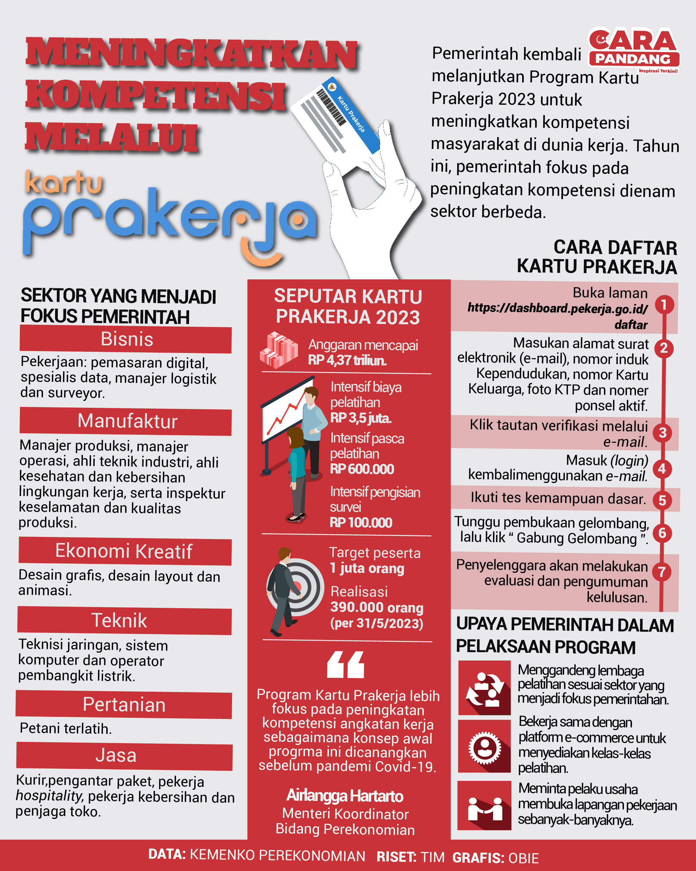 CARAPANDANG - Pemerintah kembali melanjutkan Program Kartu Prakerja 2023 untuk meningkatkan kompetensi masyarakat di dunia kerja. Tahun ini, pemerintah fokus pada peningkatan kompetemsi dienam sektor berbeda.