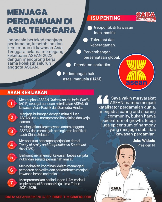 CARAPANDANG - Indonesia bertekad menjaga perdamaian, kesetabilan dan kemkmuran di kawasan Asia Tenggara selama memegang keketuaan ASEAN 2023 dengan mendorong kerja sama kolekstif seluruh anggota ASEAN.